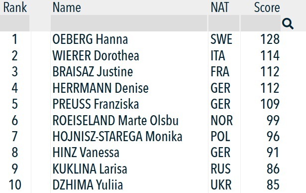 Четвертого места Эберг хватило для того, чтобы обеспечить себе Малый Кубок мира в индивидуальных гонках. Юлия Джима замкнула топ-10.