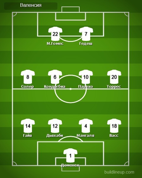 «Валенсия»: Хауме Доменек, Хосе Гайя, Муктар Дьяхаби, Эльяким Мангаля, Даниэль Васс, Карлос Солер, Жоффри Кондогбиа, Даниэль Парехо, Ферран Торрес, Макси Гомес (Кевин Гамейро, 73), Гонсалу Гуэдеш (Денис Черышев, 64)