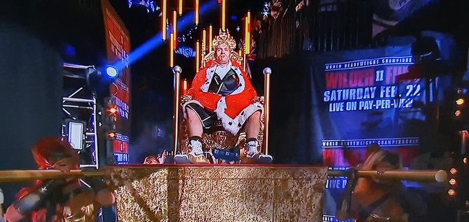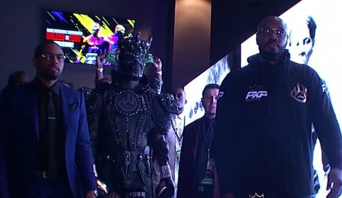 07:00. Тайсон красиво выходит, в короне! Ведь он Цыганский король! И усаживается на трон!