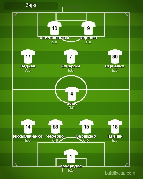 «Заря»: Заури Махарадзе, Aлександр Тымчик, Виталий Вернидуб, Евгений Чеберко, Богдан Михайличенко, Ловро Цвек, Владлен Юрченко, Владислав Кочергин, Богдан Леднев (Максим Лунёв, 90), Дмитрий Хомченовский (Владислав Кабаев, 60), Михайло Перович (Артем Громов, 78)