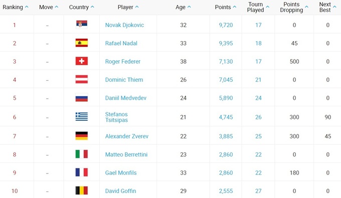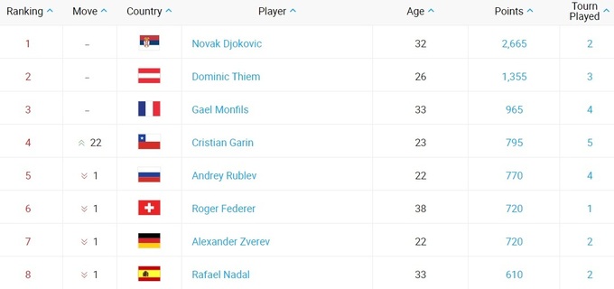 В первой десятке изменений не случилось, но уже не следующей неделе Роджер Федерер, который перенес операцию на колене, точно уступит третью позицию Доминику Тиму.