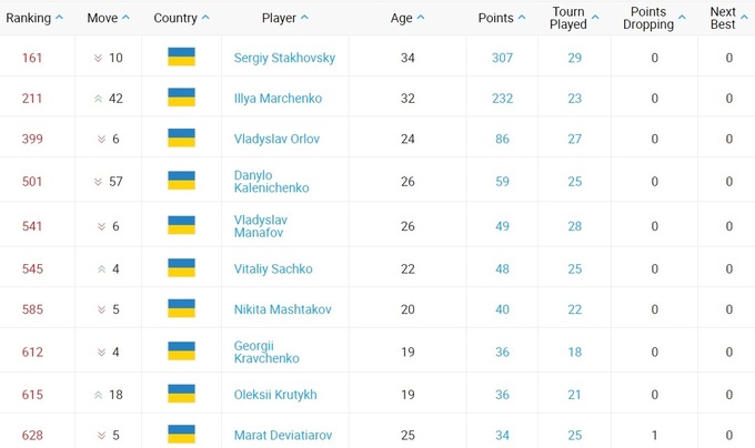 Что касается украинцев, то больше всех порадовал, конечно же, Илья Марченко, который вышел в финал челленджера в Бергамо. К несчастью, матч за титул был отменен из-за коронавируса, поэтому финал не проводился и оба участника, по большому счету, оказались в проигрыше. Очень жаль, ведь Илья мог вернуться во вторую сотню. Сергей Стаховский не сумел преодолеть квалификацию в Марселе и потерял 10 строчек.