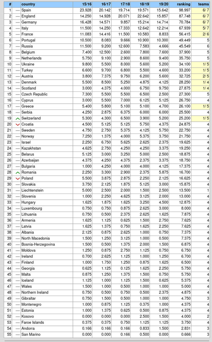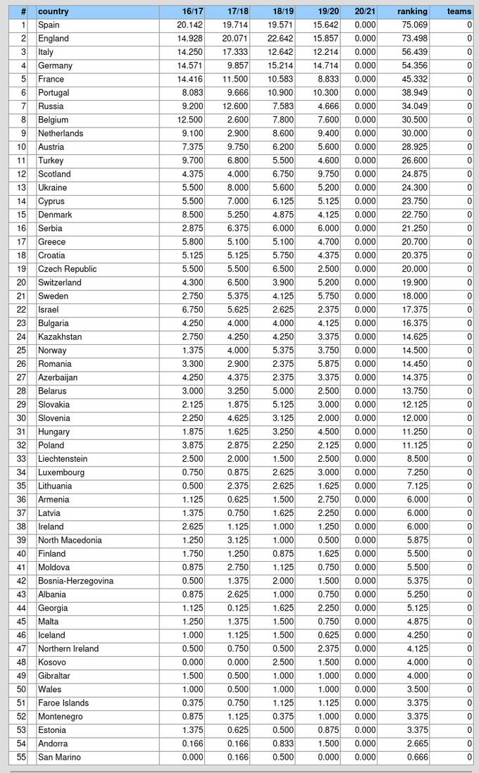 Таблица коэффициентов УЕФА 2020 (влияет на распределение путевок в сезоне 2021/22)