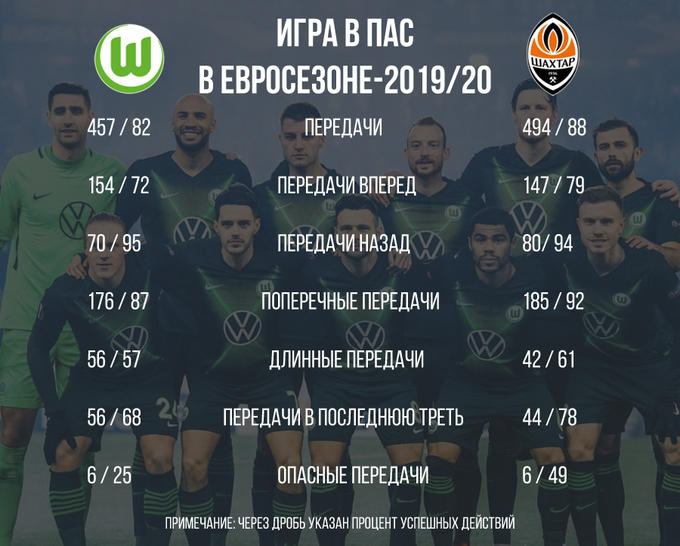 Если оценивать работу с мячом и игру в пас обеих команд, то заметно, что «Шахтер» в текущем евросезоне чуть более активен в выполнении передач. При этом, у «горняков» большее число пасов назад и поперек поля, а вот вперед отдают чаще как раз игроки «Вольфсбурга».