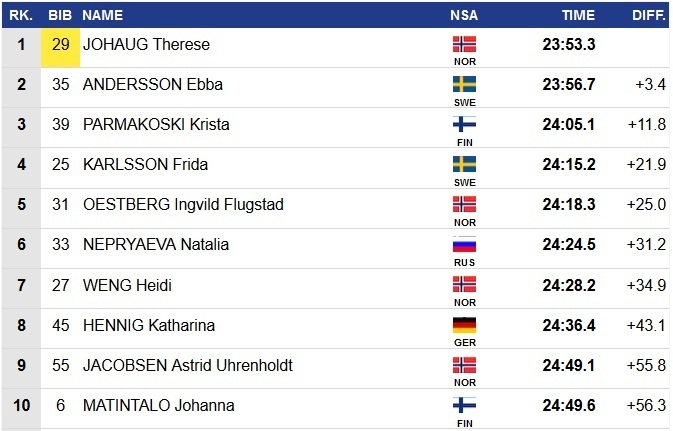Норвежская лыжница Тереза Йохауг в упорной борьбе со шведкой Эббой Андерссон выиграла разделку на 10 км классикой на этапе Кубка мира в Лахти. Третьей стала финка Криста Пармакоски.