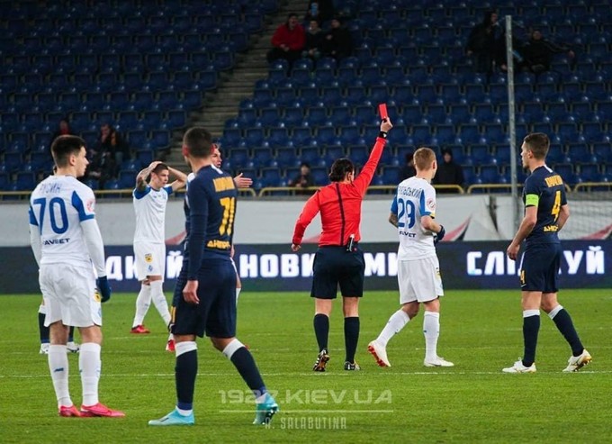 Матч в Днепре запомнился не только геройством Супряги, но и резонансным арбитражем. Главный судья поединка – Катерина Монзуль – назначила один пенальти и дважды удаляла футболистов. Во всех этих случаях она прибегала к помощи ВАР. Первый такой случай произошел уже на шестой минуте: после пересмотра видеоповтора Монзуль увидела в действиях Буяльского против Вакулко «криминал» и удалила Виталия с поля. В конце первого тайма ВАР уже сыграл в пользу гостей. Сначала Монзуль наградила предупреждением Русина за его падение в штрафной площади хозяев. Но, посмотрев «телевизор», назначила пенальти, отменив форварду «горчичник». Третий эпизод с использованием видеоповторов тоже оказался на руку киевлянам: Монзуль сначала предъявила Полевому желтую карточку за фол против Караваева, но, пересмотрев эпизод, решила показать нарушителю красную карточку.