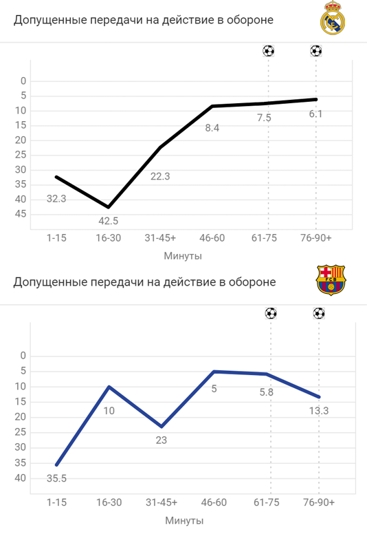 У «Реала» аналогичный показатель составил только 22%, а половину потерь мяча «бланкос» допускали в финальной трети поля, что сказывалось на эффективности завершающих действий, но несло значительно более меньшую угрозу своим воротам. Также важно выделять, что игроки «Барселоны» допустили сразу 8 потерь мяча, которые привели к ударам соперника (по 2 – Видаль, Бускетс и Семеду, по 1 – Гризманн и Пике). У «Реала» же случилась только одна потеря мяча, приведшая к удару по воротам мадридцев и ее автором оказался Марсело.