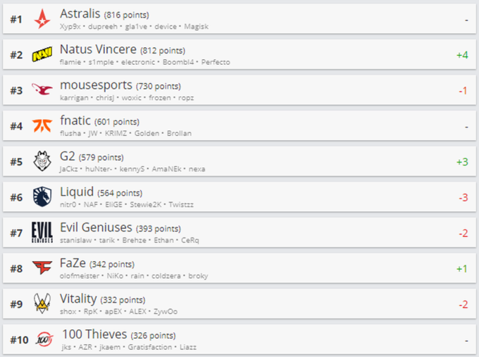 Mousesports опустилась на третье место, а Team Liquid оказалась на шестой строчке — ее место в топ-5 заняла G2 Esports. Evil Geniuses остановились на седьмой позиции. FaZe Clan обошла Team Vitality, которая потеряла два пункта.