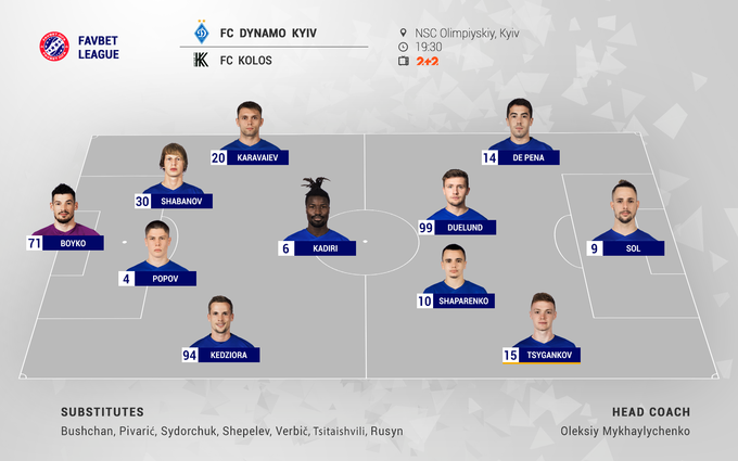 «Динамо»: Бойко, Попов, Кадири, Соль, Шапаренко, Де Пена, Цыганков, Караваев, Шабанов, Кендзера, Дуэлунд.