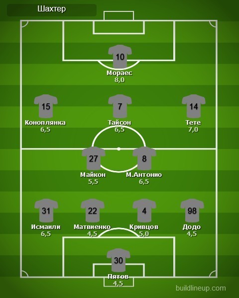«Шахтер»: Пятов, Исмаили, Кривцов (Бондарь, 74), Матвиенко, Додо (Болбат, 64), Майкон, Маркос Антонио, Тете, Коноплянка (Артем Бондаренко, 73), Тайсон, Мораес.
