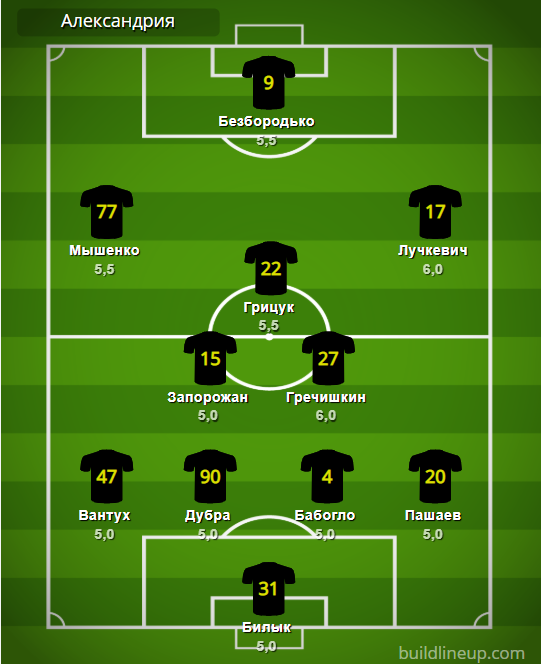 Александрия: Билык – Вантух, Дубра, Бабогло, Пашаев – Запорожан (Ковалец, 46), Грицук, Гречишкин – Мышенко (Задерака, 46), Безбородько (Ситало, 82), Лучкевич.