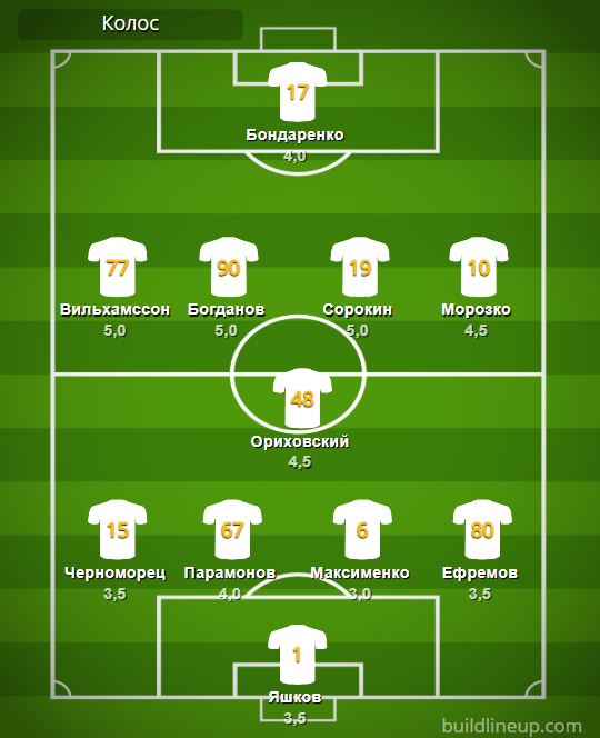 Колос: Яшков – Черноморец, Парамонов, Максименко, Ефремов – Ориховский – Вильхамссон, Богданов, Сорокин (Кожушко, 56), Морозко (Ильин, 58) – Бондаренко (Лысенко, 65).