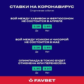 Компания FavBet предложила болельщикам линию ставок на ближайшие основные события, которые пока еще не были отменены, но находятся под угрозой. Согласно коэффициентам можно предположить, у каких соревнованиях есть шанс состояться.