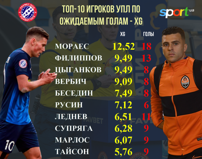 Помимо Жуниора Мораеса реальная результативность превышает показатель ожидаемых голов у Александра Филиппова («Десна»), Артема Беседина («Динамо»), Богдана Леднева («Заря»), Владислава Супряги («Днепр-1»), Марлоса и Тайсона (оба – «Шахтер»).
