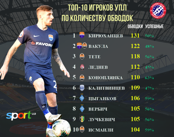 Согласно данных Wyscout, на счету Кирюханцева 131 обводка, что делает его безоговорочным лидером УПЛ по этому компоненту. Успешность действий защитника составляет 50%.