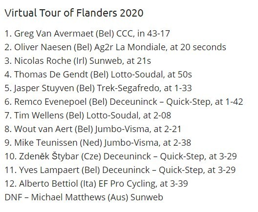 Бельгийский велогонщик Грег Ван Авермат из команды CCC одержал победу в виртуальном Туре Фландрии 2020. 13 гонщиков на тренажерах проехали последние 32 км настоящего маршрута Тура. Гонка, в которой велосипедисты крутили педали на тренировочных площадках, учитывала реальный маршрут и культовые подъемы трассы.
