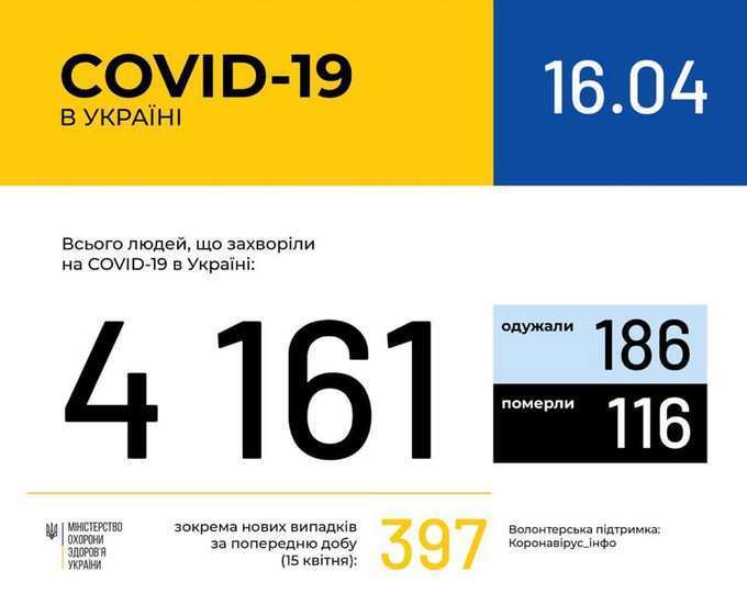 Всего в Украине выявлен 4161 лабораторно подтвержденный случай COVID-19. 186 пациентов выздоровели, 116 — умерли.