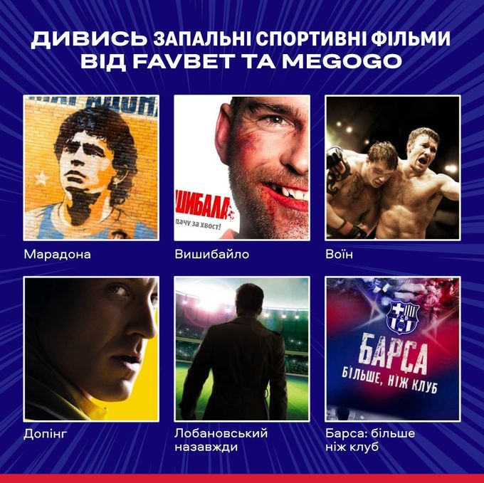 Компания Favbet также не осталась в стороне и совместно с Megogo подготовила для болельщиков подборку фильмов на спортивную тематику , которые помогут скрасить время в ожидании, когда вернется большой спорт. Просмотр всех фильмов при этом, конечно же, бесплатный.