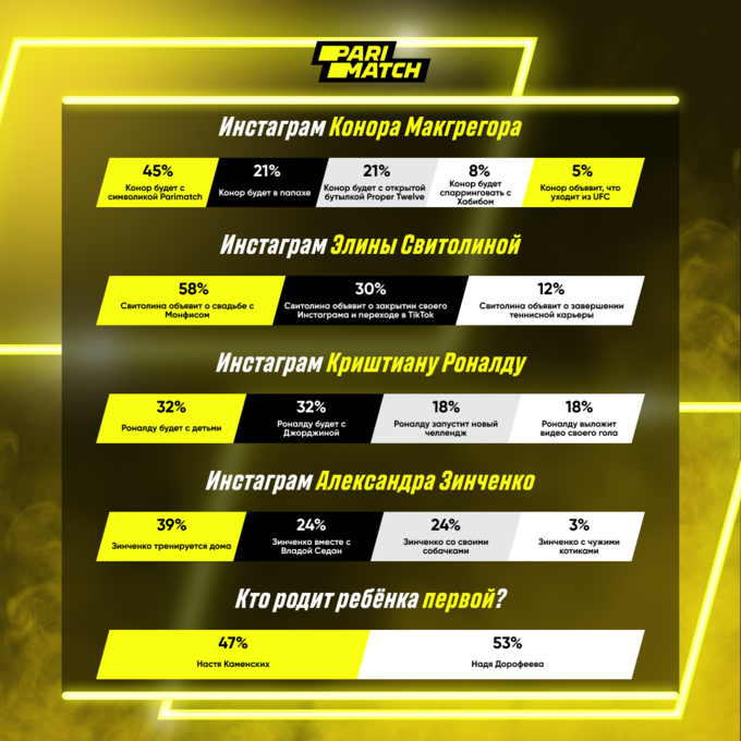 А вот Александр Зинченко, игрок сборной Украины и «Манчестер Сити», скорее всего, покажет, как тренируется дома (39%) или запостит фото/видео с Владой Седан (34%). Также эксперты Parimatch не исключают, что очередной пост футболиста будет посвящен его собачкам (24%) и очень вряд ли, что чужим котикам (3%). Другие линии позволяют спрогнозировать, набьет ли себе «динамовскую» татуировку Коноплянка или с чем сфотографируется Конор Макгрегор для своей страницы в Instagram. Любители поп-музыки могут попробовать угадать, родит ли певица Надя Дорофеева ребенка до конца 2021 года.