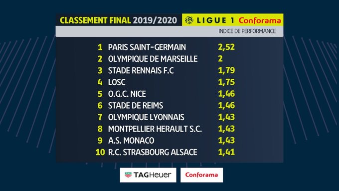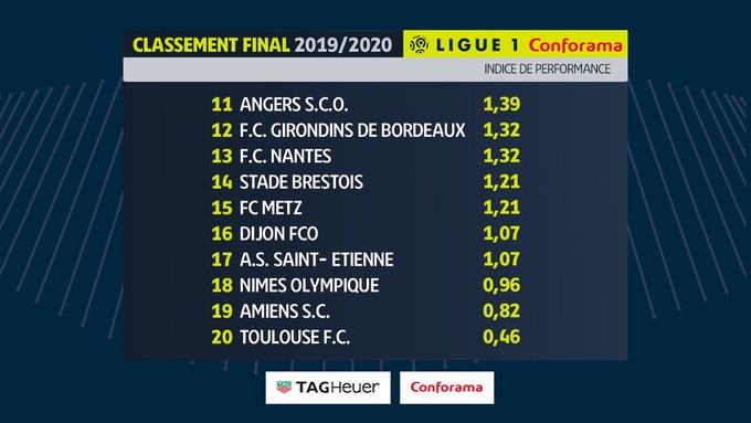 Итоговая классификация чемпионата Франции 2019/20: Лига 1