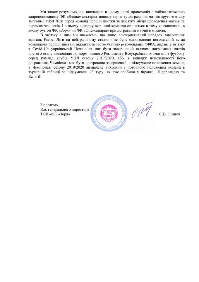 «Если альтернативный порядок завершения соревнований УПЛ на нейтральном стадионе не будет единогласно согласован всеми командами первой шестерки, подлежат применению рекомендации ФИФА, выданные в связи с COVID-19: украинский Чемпионат должен быть завершен путем доигрывания матчей второго этапа в соответствии с нормами действующего Регламента Всеукраинских соревнований по футболу среди команд клубов УПЛ сезона 2019/2020, или, в случае невозможности его доигрывание, Чемпионат должен быть досрочно завершен, а итоговое положение команд в Чемпионате сезона 2019/2020 определено исходя из текущего положения команд в турнирной таблице по итогам 23 тура, как уже сделали во Франции, Нидерландах и Бельгии», – говорится в официальном письме луганского клуба.
