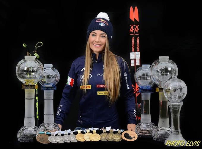 Итальянская биатлонистка сфотографировалась со своими глобусами и медалями главных стартов
