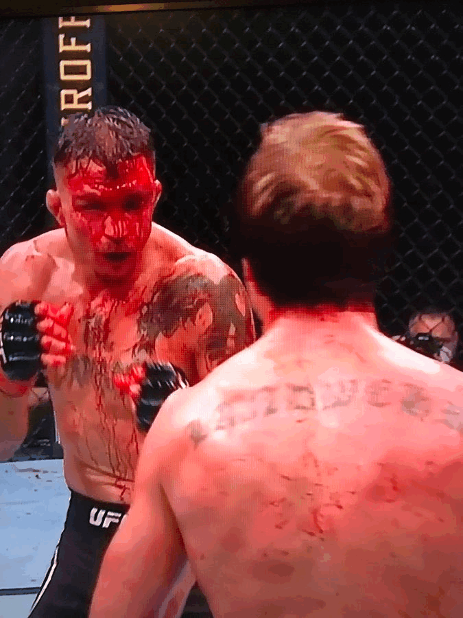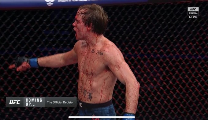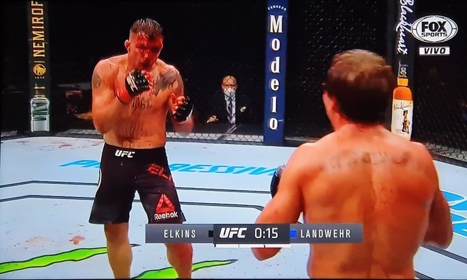 Даррен Элкинс после удара локтем получил серьезное рассечение, но сумел довести бой до конца, забрызгав кровью весь октагон.
