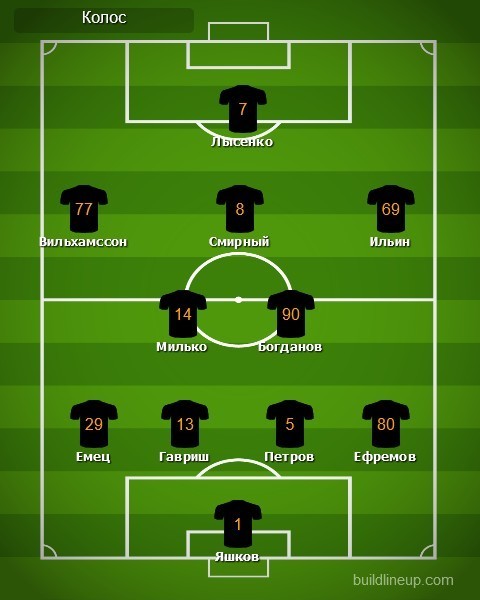 «Колос»: Антон Яшков, Евгений Ефремов, Виталий Гавриш, Кирилл Петров, Владислав Емец, Андрей Богданов, Вадим Милько (Станислав Сорокин, 86), Евгений Смирный (Евгений Морозко, 83), Олег Ильин (Олег Кожушко, 73), Арни Вильхамссон (Денис Костышин, 83), Владимир Лысенко (Александр Бондаренко, 83)