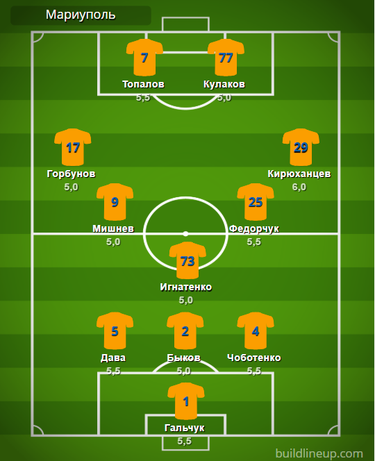 Мариуполь: Гальчук – Дава, Быков, Чоботенко – Горбунов (Корниенко, 57), Мишнев, Игнатенко, Федорчук (Кащук, 76), Кирюханцев (Тищенко, 76) – Топалов (Чурко, 64), Кулаков (Фомин, 64).