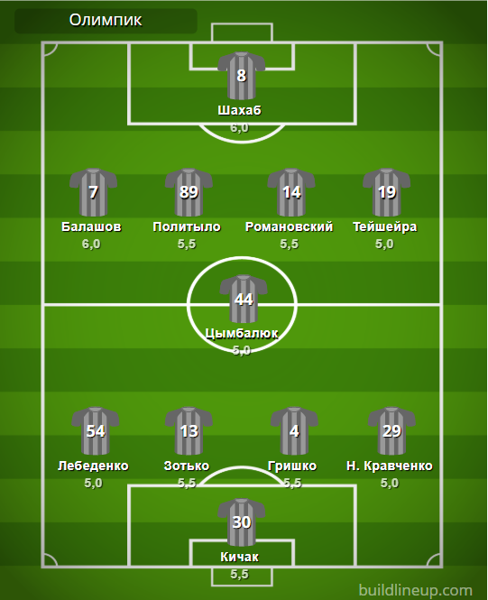 Олимпик: Кичак – Лебеденко, Зотько, Гришко, Н. Кравченко – Цымбалюк – Балашов (Баланюк, 74), Политыло, Романовский (Кравчук, 64), Тейшейра (Е. Пасич, 64) – Шахаб (Ксенз, 86).