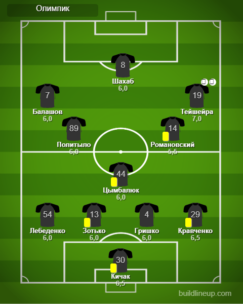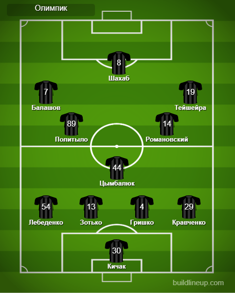 «Олимпик»: Кичак – Лебеденко, Зотько, Гришко, Кравченко, Цымбалюк, Политыло, Романовский (Завийский, 74), Балашов (Пасич, 62), Тейшейра (Ксёнз, 85), Шахаб (Баланюк, 74).