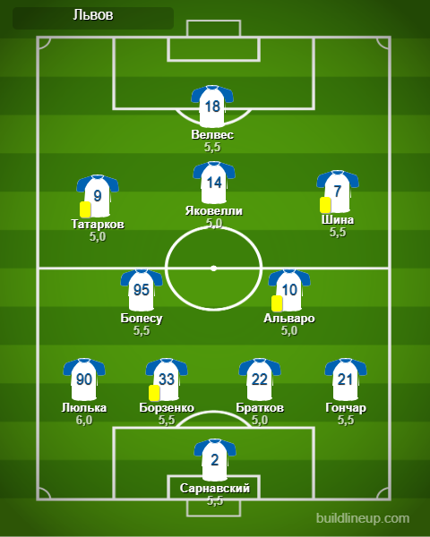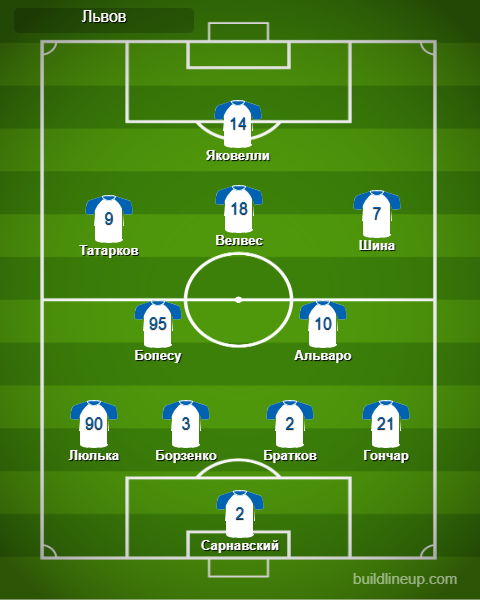 «Львов»: Сарнавский – Люлька (Ходаковский, 77), Братков, Гончар, Татарков, Борзенко, Альваро, Шина, Бопесу, Велвес (Приймак, 58), Яковелли (Ныч, 58).