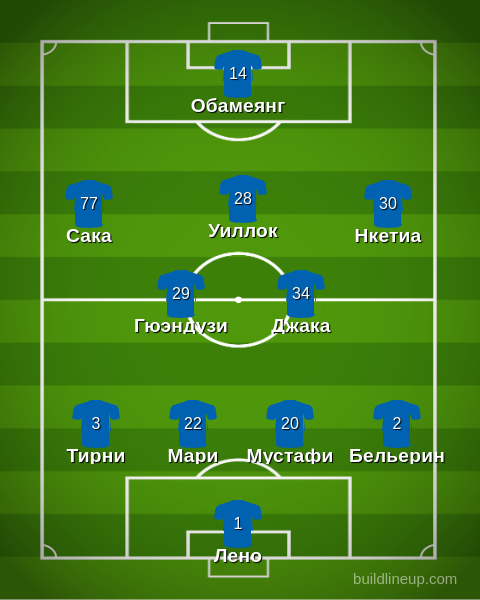 «Арсенал»: Лено - Бельерин, Мари (Луис, 22), Мустафи, Тирни - Джака (Себальос, 7), Гюэндузи (Мэйтенд-Найлс, 67) - Нкетиа (Ляказеттт, 67), Уиллок (Нелсон, 67), Сака - Обамеянг