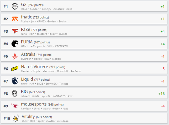 После победы на DreamHack Masters Spring 2020 для Европы BIG поднялась на 16 пунктов и заняла восьмое место, опередив mousesports. Evil Geniuses покинули первую десятку и расположились на 12-й строчке — за ними остановились MAD Lions и ENCE eSports, которые прибавили по четыре позиции.