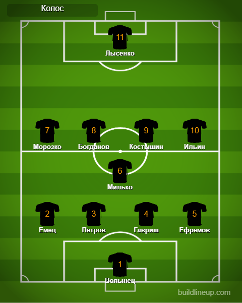 «Колос»: Евгений Волынец - Евгений Ефремов, Кирилл Петров, Евгений Морозко (Вадим Парамонов, 84), Виталий Гавриш - Вадим Милько, Владислав Емец, Олег Ильин (Денис Антюх, 84), Андрей Богданов - Владимир Лысенко (Олег Кожушко, 73), Денис Костышин (Арни Вильхамссон, 62).