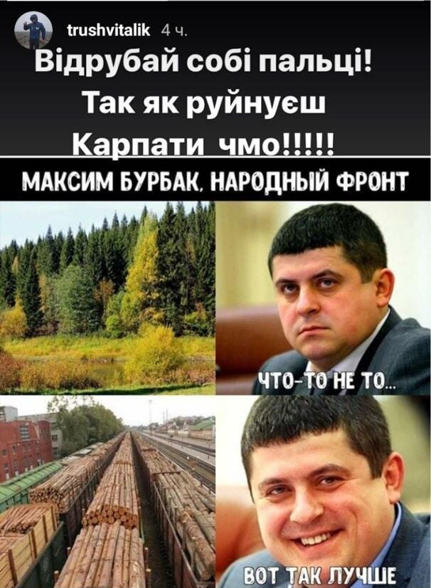 Биатлонист сборной Украины Виталий Труш оскорбил экс-министра инфраструктуры Максима Бурбака, которого обвиняют в незаконной вырубке лесов в Карпатах.