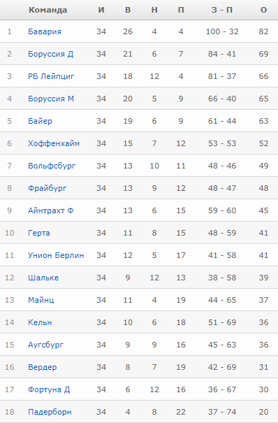 Топ-7 Бундеслиги: «Бавария» (82), «Боруссия» Д (69), «РБ Лейпциг» (66), «Боруссия» М (65), «Байер» (63), «Хоффенхайм» (52), «Вольфсбург» (49).
