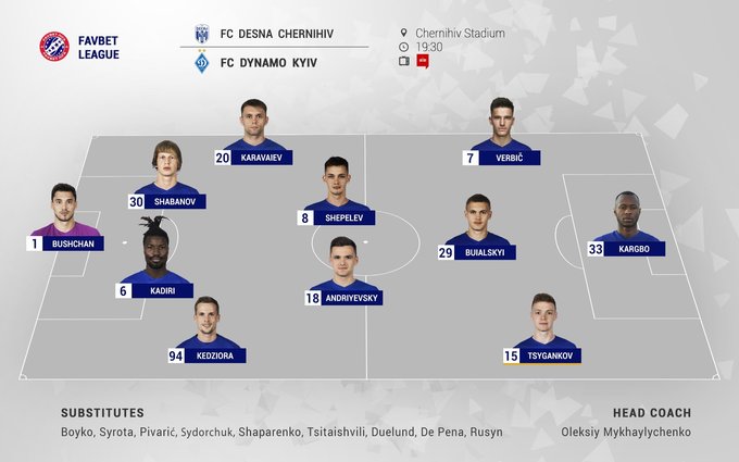 «Динамо»: Бущан, Кадири, Вербич, Шепелев, Цыганков, Андриевский, Караваев, Буяльский, Шабанов, Каргбо, Кендзера.