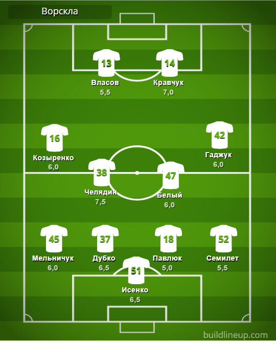 Ворскла: Исенко – Мельничук, Дубко, Павлюк, Семилет (Посевкин, 90+2) – Козыренко (Бугаенко, 83), Челядин, Белый (Галата, 46), Гаджук (Кулаковский, 90+2) – Власов (Дмитрук, 73), Д. Кравчук.