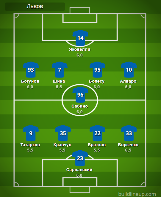 Львов: Сарнавский – Татарков, Ю. Кравчук (Гончар, 69), Братков, Борзенко – Сабино – Богунов, Шина (Приймак, 77), Бопесу (Клименчук, 69), Алваро (Ренан, 56) – Яковелли.