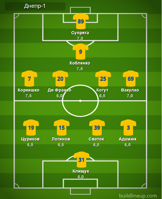 Днепр-1: Клищук – Цуриков, Логинов, Сваток (Лопыренок, 73), Адамюк – Коркишко (Булеца, 62), Ди Франко (Снижко, 73), Когут (Кравченко, 62), Вакулко – Хобленко – Супряга (Чичиков, 81).