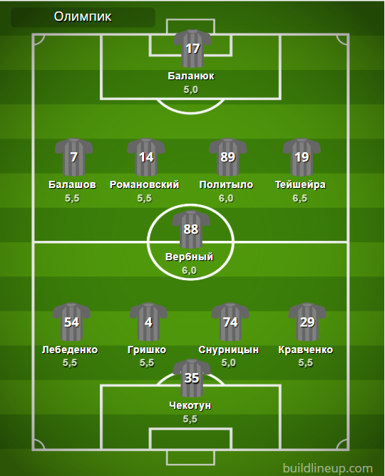 Олимпик: Чекотун – Лебеденко, Гришко, Снурницын, Кравченко – Вербный (Чогадзе, 74) – Балашов (Дегтярев, 65), Романовский (Завийский, 65), Политыло, Тейшейра – Баланюк (Шахаб, 22).