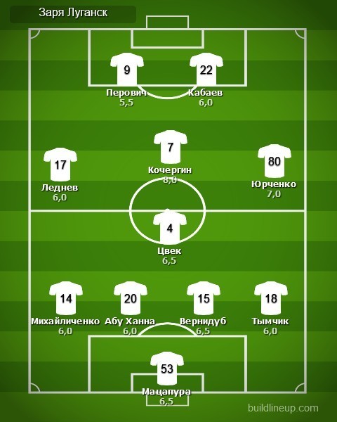 «Заря»: Дмитрий Мацапура, Aлександр Тымчик (Никита Каменюка, 79), Виталий Вернидуб, Джоель Абу Ханна (Дмитрий Хомченовский, 22), Богдан Михайличенко (Андрейс Цыганикс, 56), Ловро Цвек, Богдан Леднев, Владлен Юрченко, Владислав Кочергин (Артем Громов, 55), Владислав Кабаев (Максим Лунёв, 78), Михайло Перович.