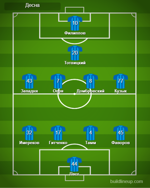«Десна»: Паст, Фаворов, Тамм (Арвеладзе, 78), Гитченко, Имереков, Огиря, Домбровский, Кузык (Картушов, 61), Западня (Мостовой, 61), Тотовицкий (Будковский, 61), Филиппов (Хлёбас, 83).