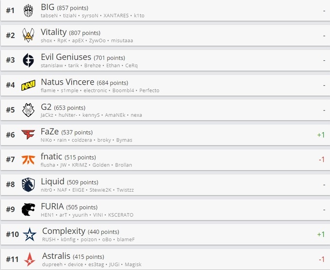 Возглавляет рейтинг BIG. На втором месте Team Vitality, а на третьем Evil Geniuses.
