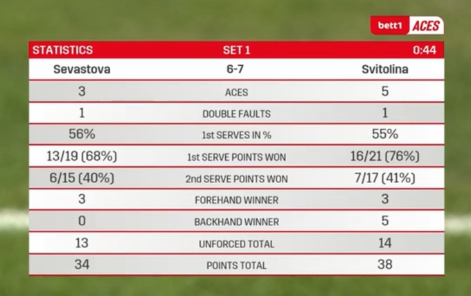 При счете 5:5 Севастова сумела реализовать скрытый сетбол и дело шло к тому, что именно она выиграет стартовую партию. Но Элина под ноль взяла подачу латвийки и лучше проявила себя на тай-брейке, выиграв его искусным укороченным ударом с небольшой помощью троса.