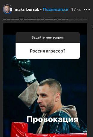 На вопрос: «Чей Крым?» – украинский боксер ответил: «Крымчан». А на вопрос о том, является ли Россия агрессором, боксер де-факто отвечать не стал, написав: «Провокация».