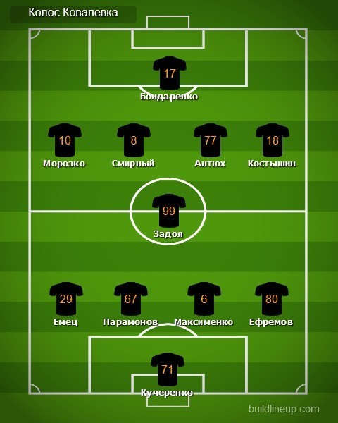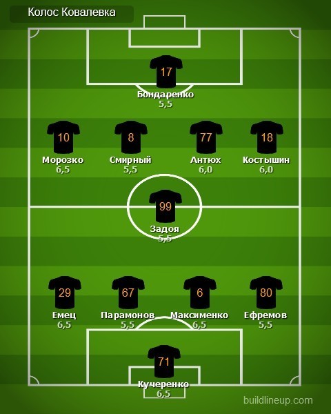 «Колос»: Евгений Кучеренко, Евгений Ефремов, Максим Максименко, Вадим Парамонов, Владислав Емец, Евгений Задоя (Андрей Богданов, 65), Денис Костышин (Павел Ориховский, 65), Евгений Смирный (Кирилл Сенько, 75), Денис Антюх, Евгений Морозко (Станислав Сорокин, 75), Aлександр Бондаренко (Олег Кожушко, 78).