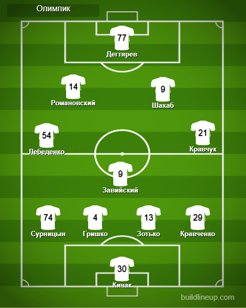 «Олимпик»: Бетим – Снурницын (Гошкодеря, 46), Гришко, Зотько, Кравченко (Ксёнз, 62) – Завийский – Лебеденко, Кравчук (Вербный, 77), Романовский (Балашов, 62), Шахаб – Дегтярев (Лукьянчук, 79).