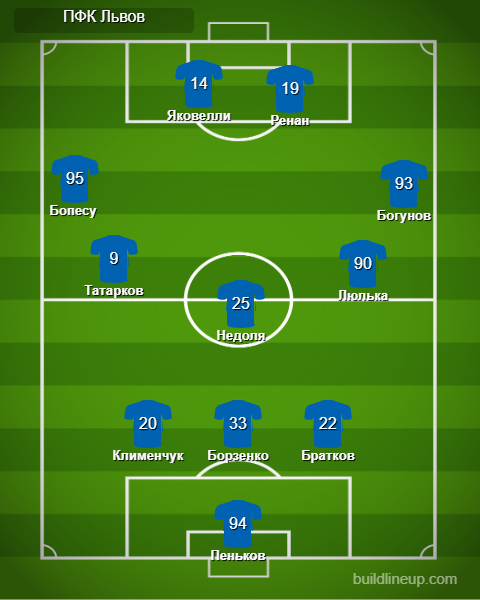 «Львов»: Пеньков – Борзенко, Братков, Клименчук – Бопесу (Приймак, 46), Татарков, Люлька (Фелипе, 64), Богунов, Недоля – Ренан (Велвес, 81), Яковелли.